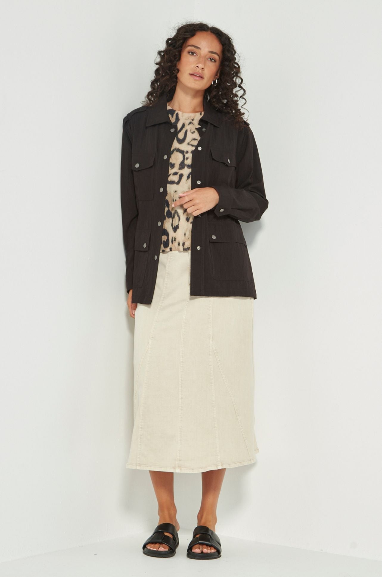 Gored panel detailing adds shape and dimension, while front curved pockets and back patch pockets give it classic denim styling with a twist. Finished with a fly front and belt loops, it’s the skirt that works as hard as your favourite jeans—only with a little more swing.
