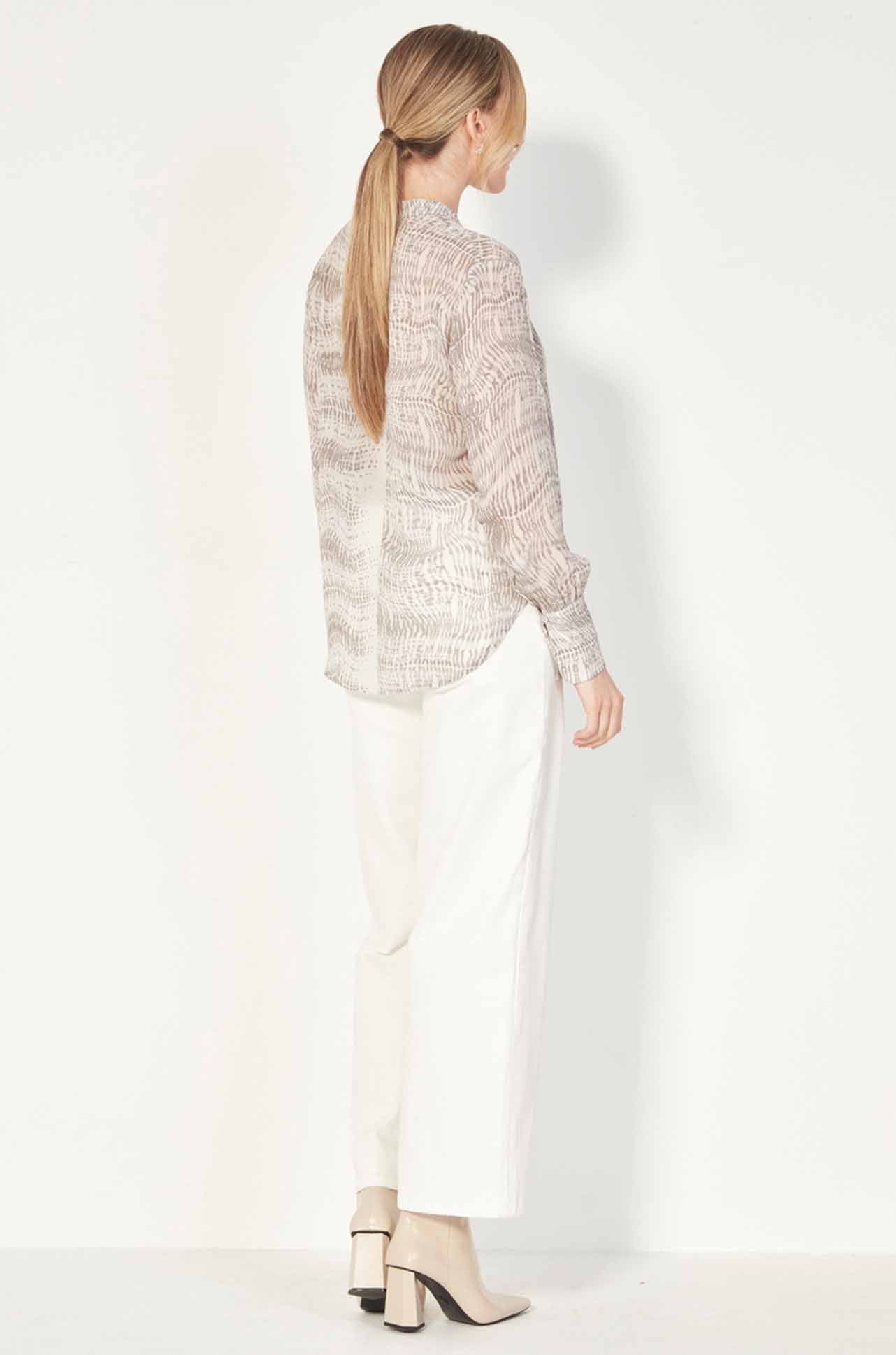 The 'Leon Shirt' from Verge features a delicate print, low mandarin collar, and button through front, providing a stylish and professional look. The full length sleeve is softly gathered and the back yoke adds a touch of elegance. The high low curved hemline falls below the hip, creating a flattering silhouette. Complete with a cami, this shirt is perfect for any occasion.