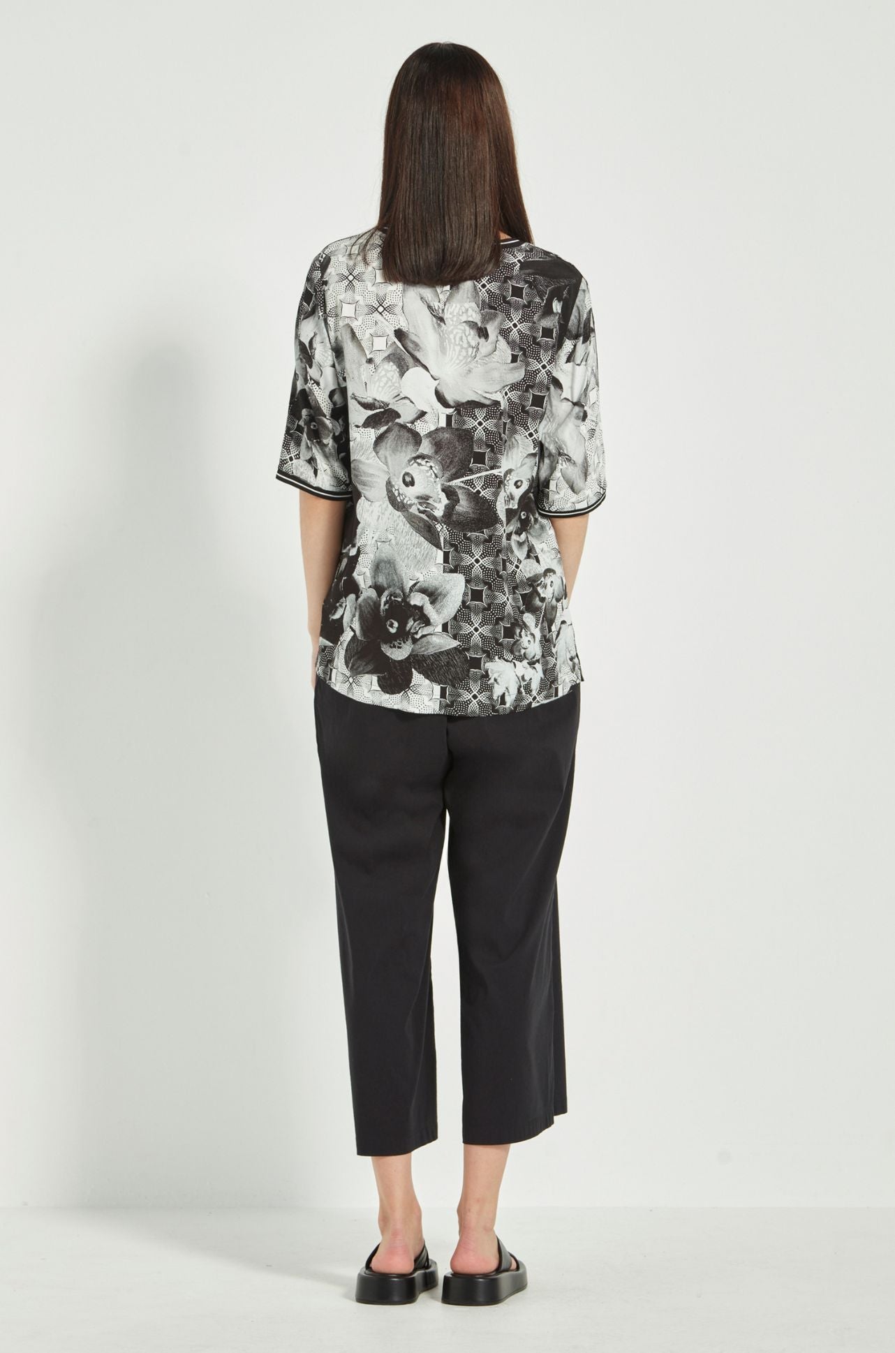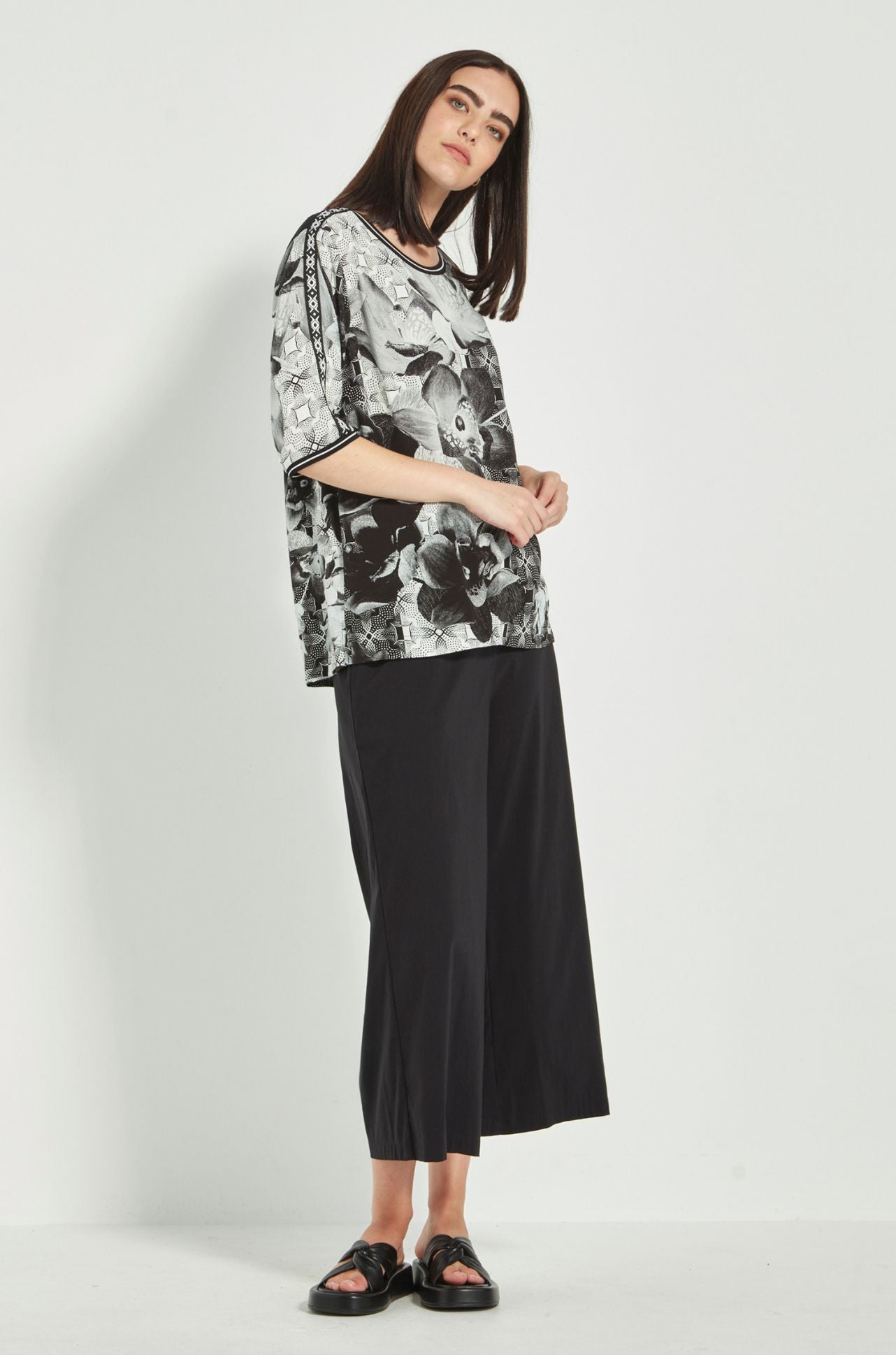 The 'Macy Top' from Verge features a printed shell design with a rib-knit trim at the neckline and cuffs, accented by a bold striped detail.