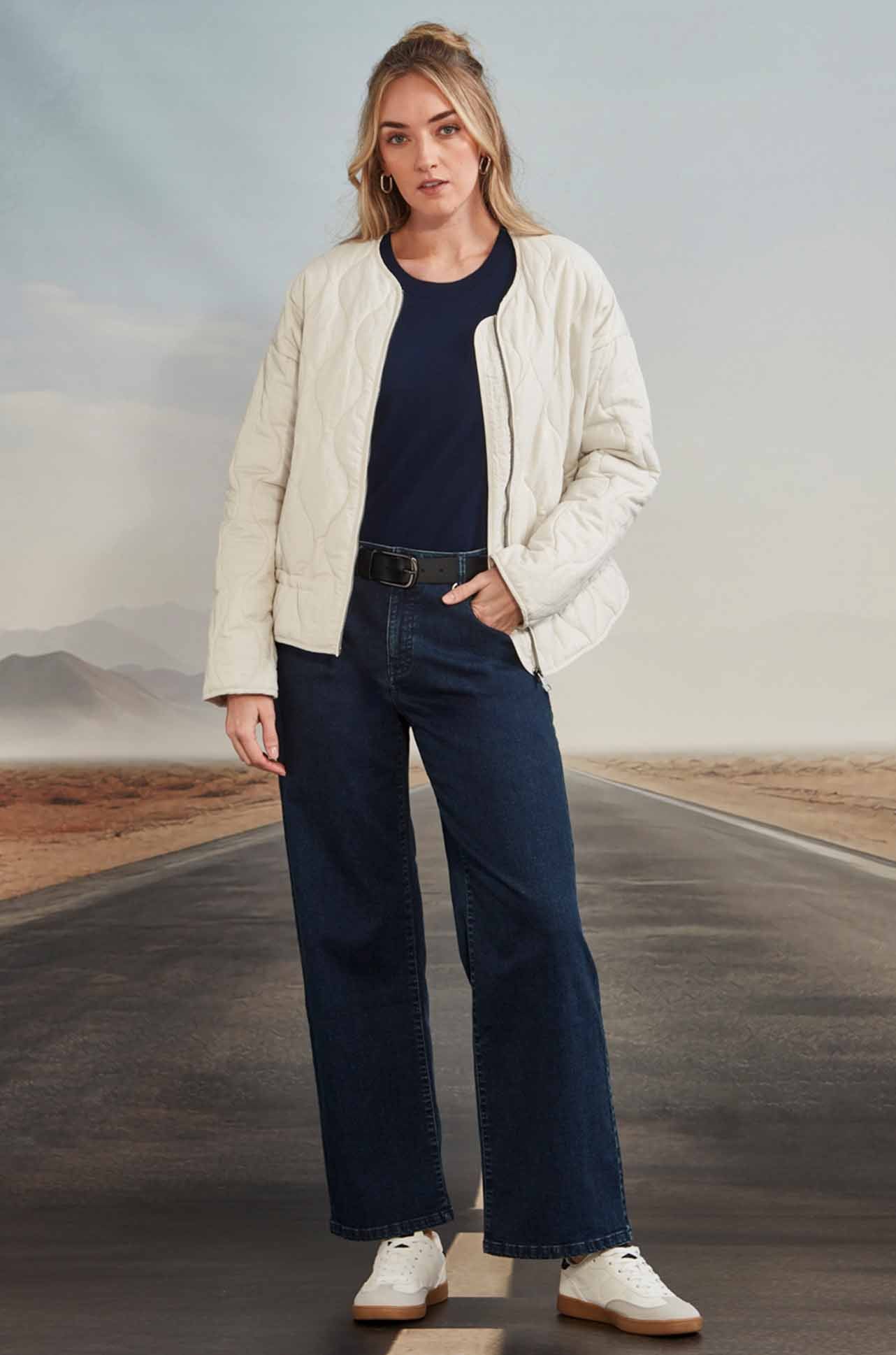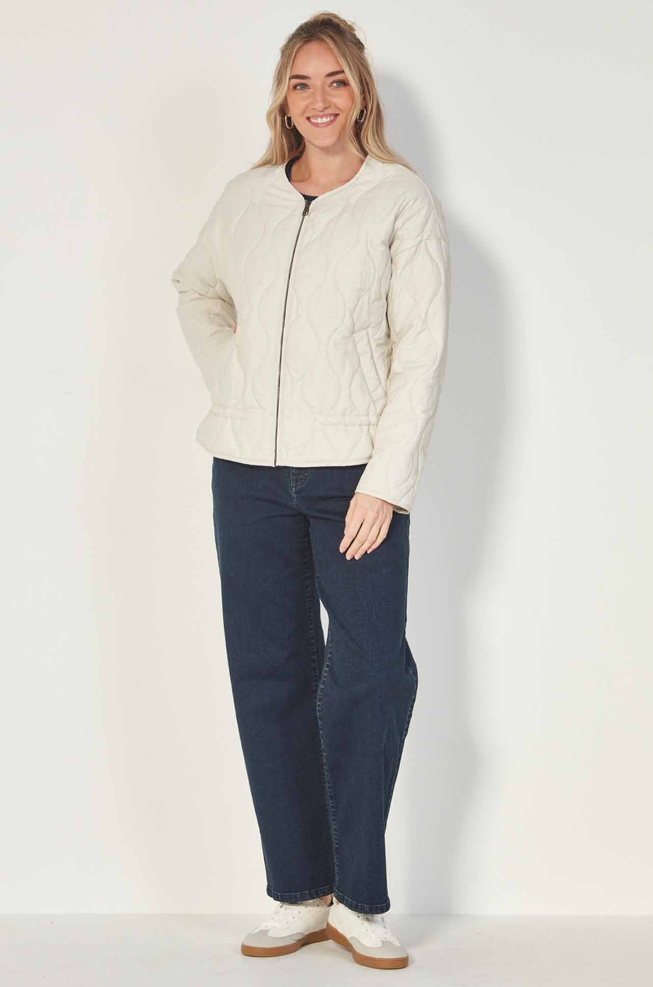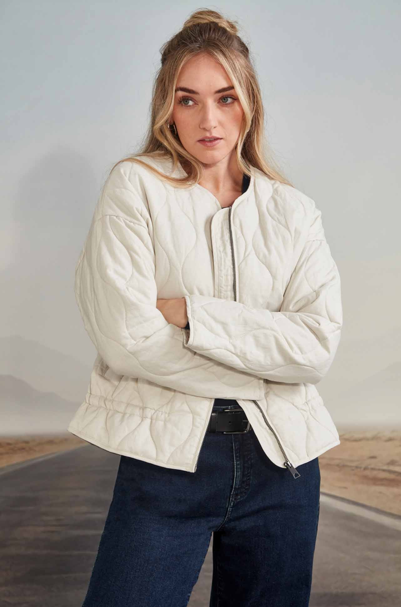 The 'Vega Jacket' from Verge is a versatile addition to any wardrobe, combining comfort and style with its cotton and metal quilted material. The round neckline and zip front provide a sleek look, while the angled side pockets offer practicality. The full length sleeves and contrast bronze quilted lining add a touch of sophistication. With the option of a drawcord for shaping and a hip-length fit, this jacket is a must-have for this season and beyond.