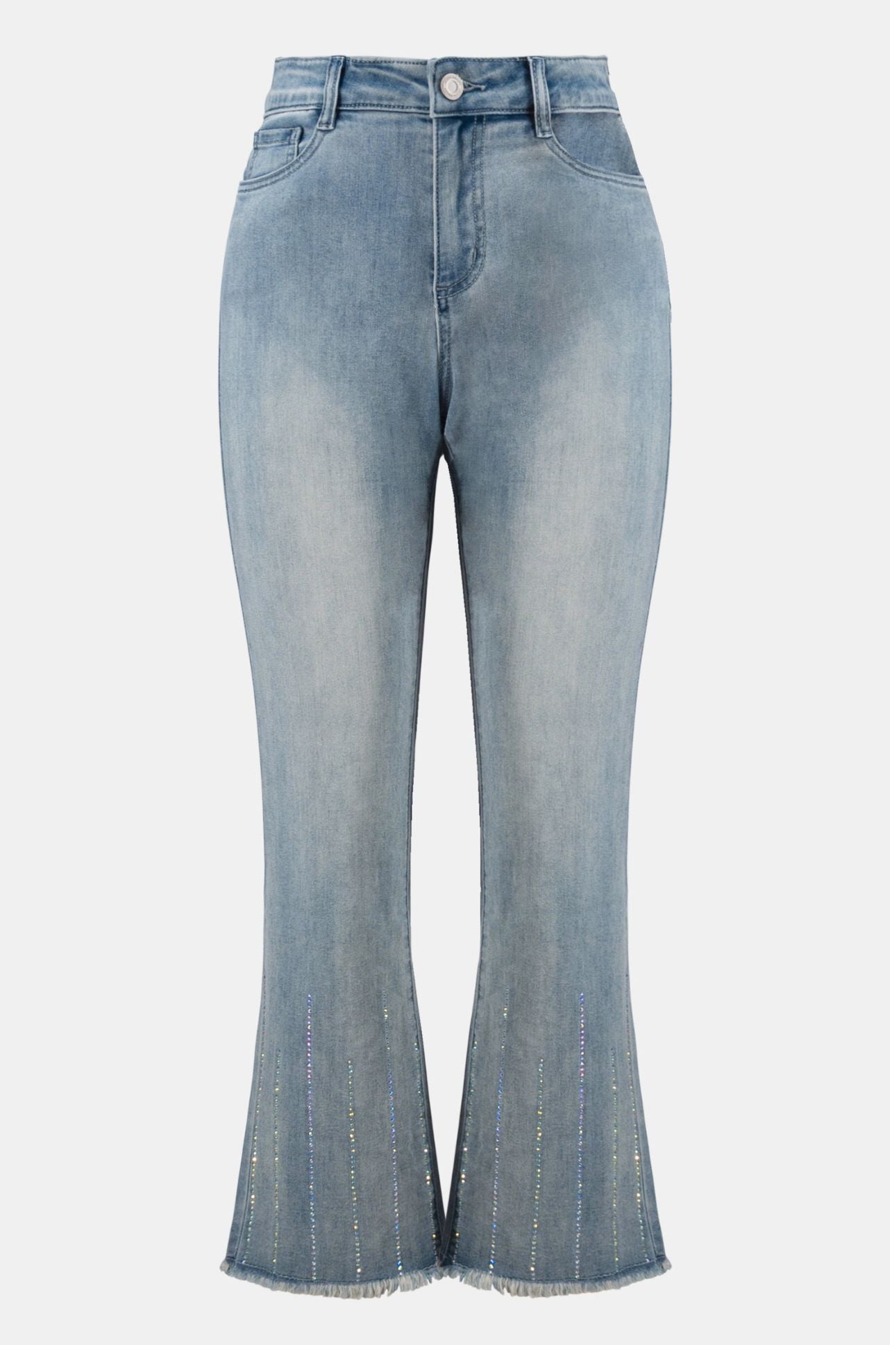 The Joseph Ribkoff 'Straight Crop Jeans with Rhinestones' FEATHERWEAVE™ denim crop pants feature a straight-leg silhouette, frayed hems, and heat-transfer rhinestones for subtle shine.
