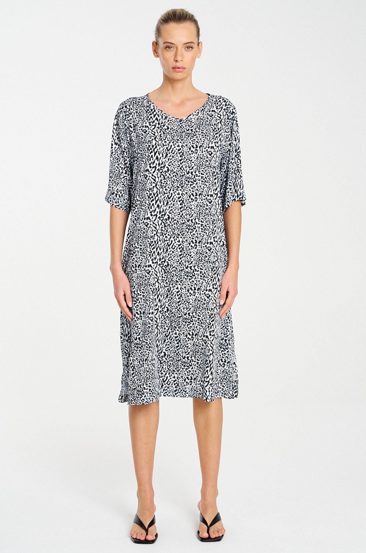 Crafted with Mela Purdie’s smooth fluid stretch Charmeuse fabrication in the Bold Animalia Print. The 'Plaza Dress' from Mela Purdie features a relaxed silhouette with splits at the side seam.
