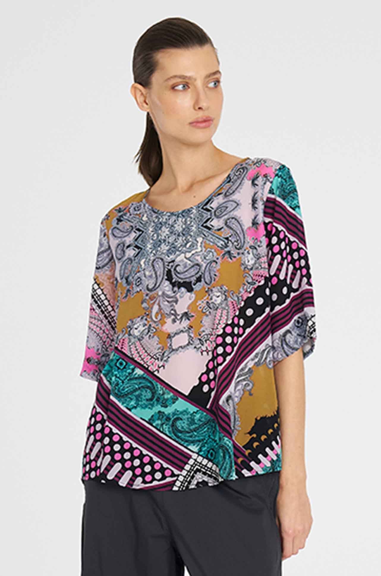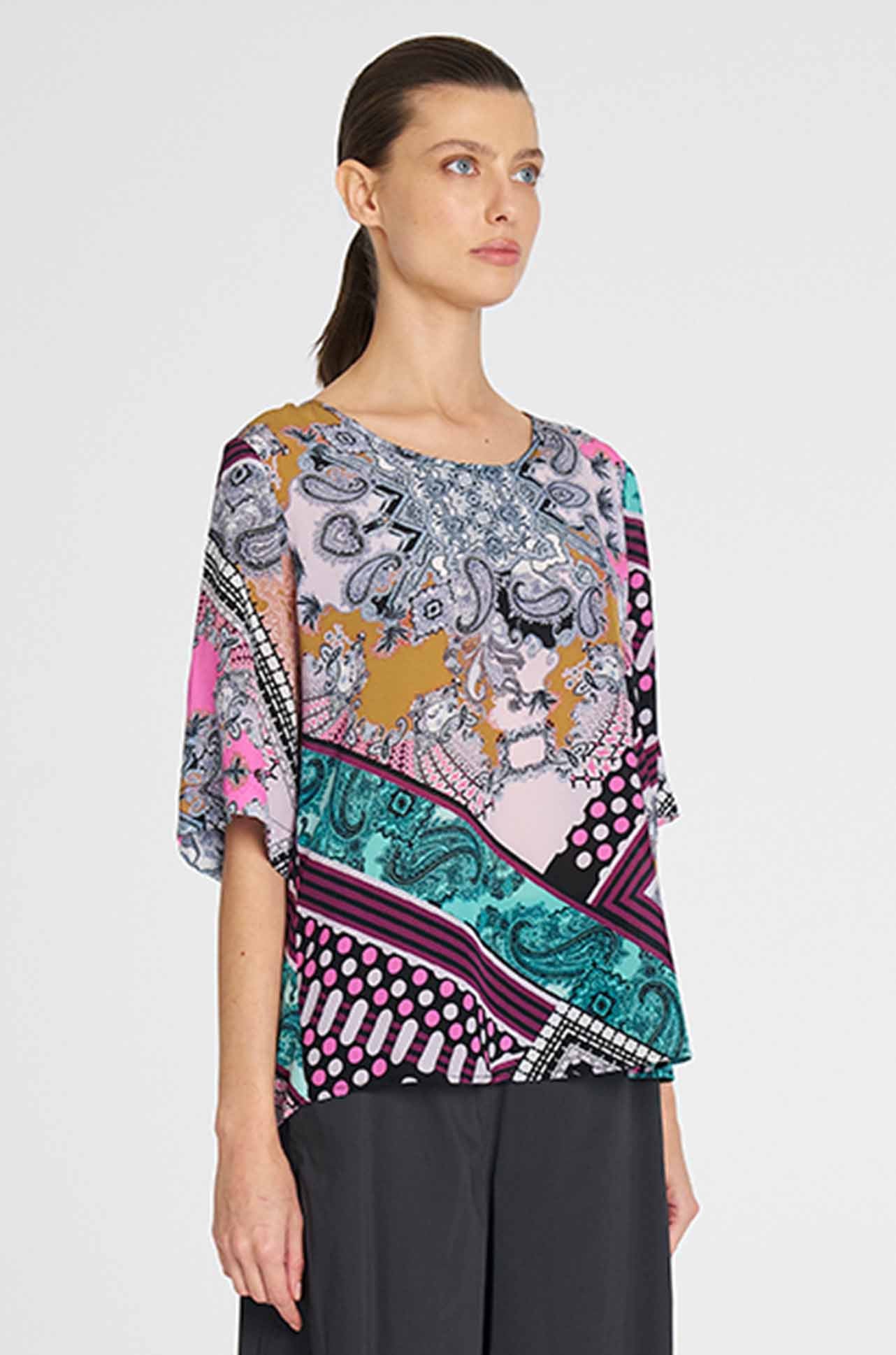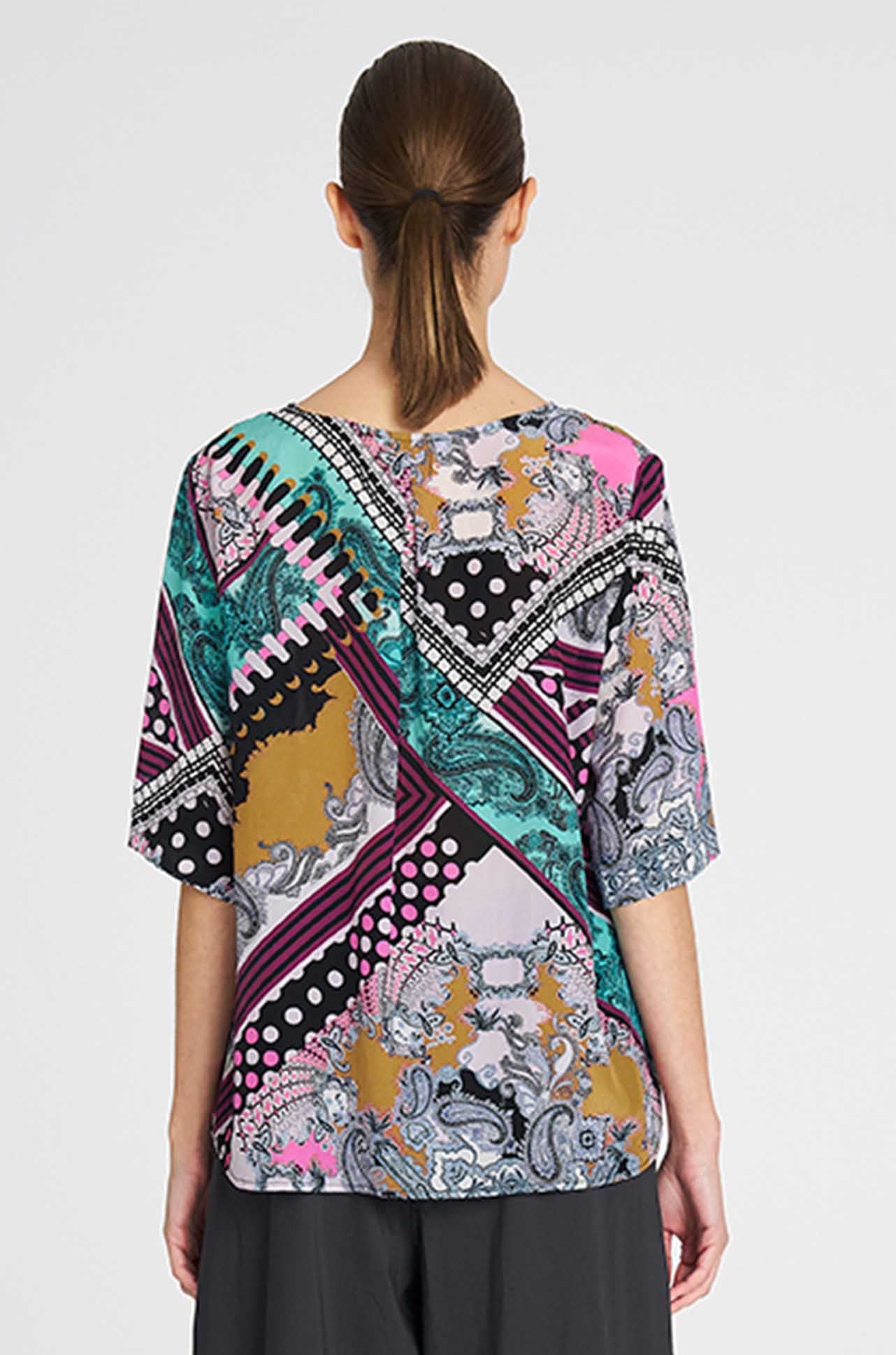 The 'Plaza T' features a generous, boxy fit with a classic rounded neckline. Crafted in Mela Purdie's mid-weight, soft washed Silk Crepe De Chine, in the striking Bandana Silk Print, it is the perfect statement piece to compliment any wardrobe