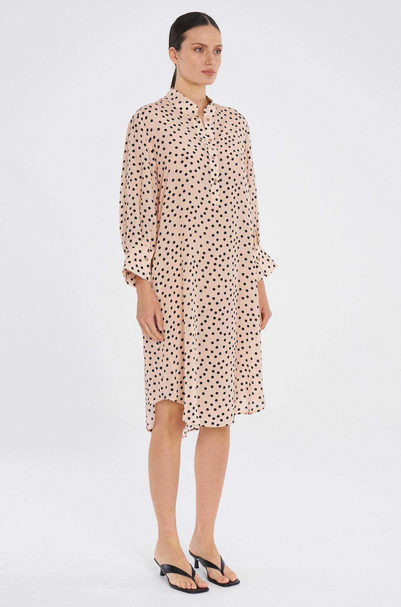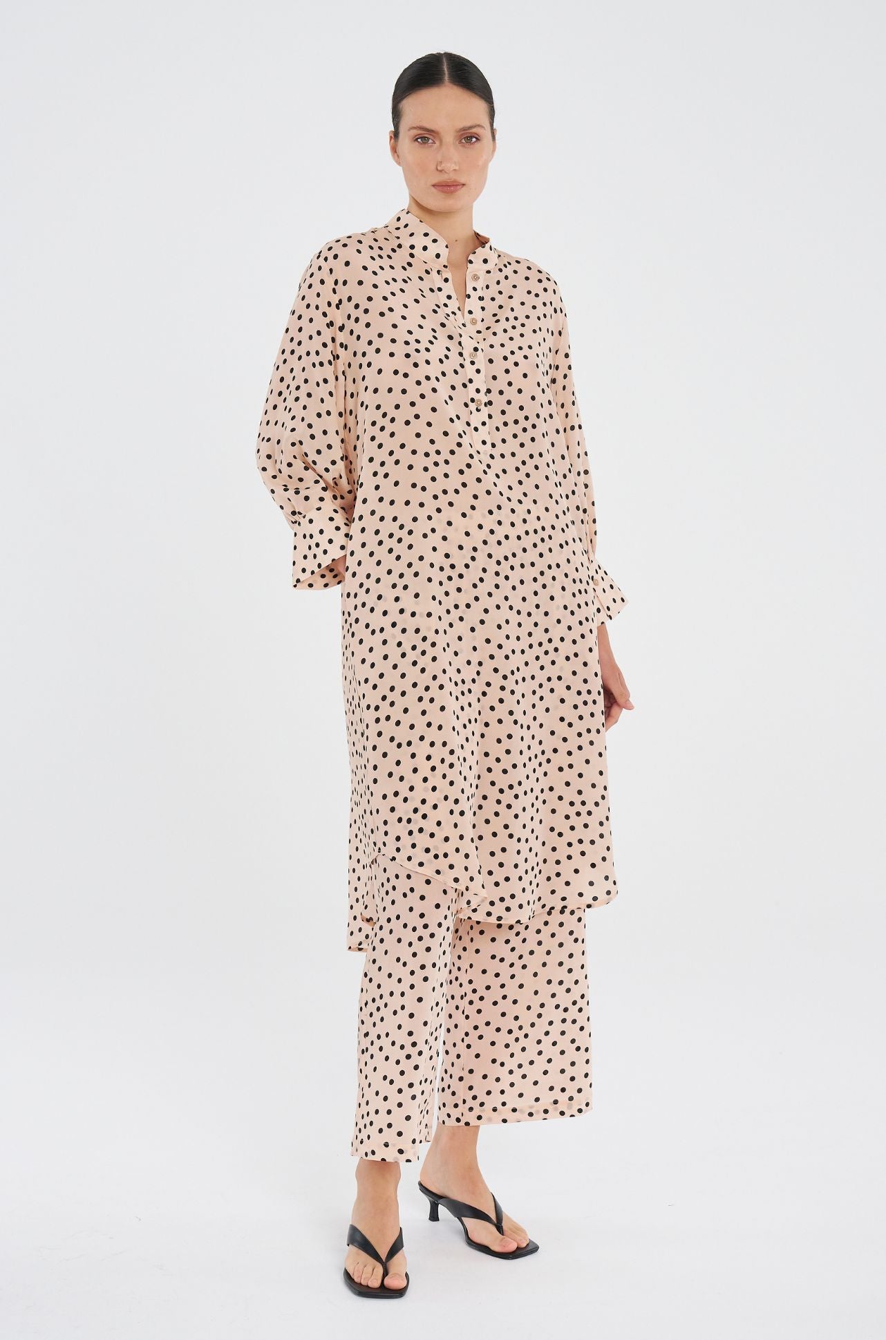 Crafted in Mela Purdie's mid-weight, soft washed Silk Crepe De Chine, in the effortless Scattered Spot Print, an easy to wear print for all occasions. The 'Villa Overshirt' from Mela Purdie offers a relaxed fit silhouette and stand collar, this is a wardrobe essential.