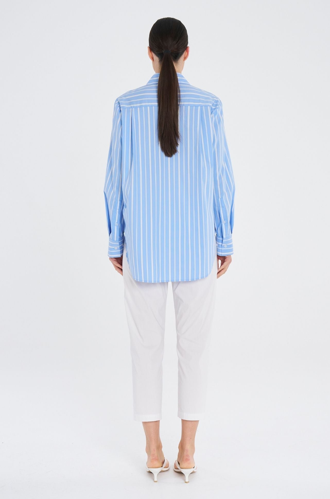 Crafted in Mela Purdie's Lightweight Microprene, in the sophisticated Saville Stripe. A crisp, cotton rich fabric with high stretch and a polished finish and yarn dyed stripe. The 'Saville Shirt' from Mela Purdie is an elevated staple featuring a crisp collar and pocket detailing, the long line silhouette makes an easy wear versatile piece suitable for any wardrobe.