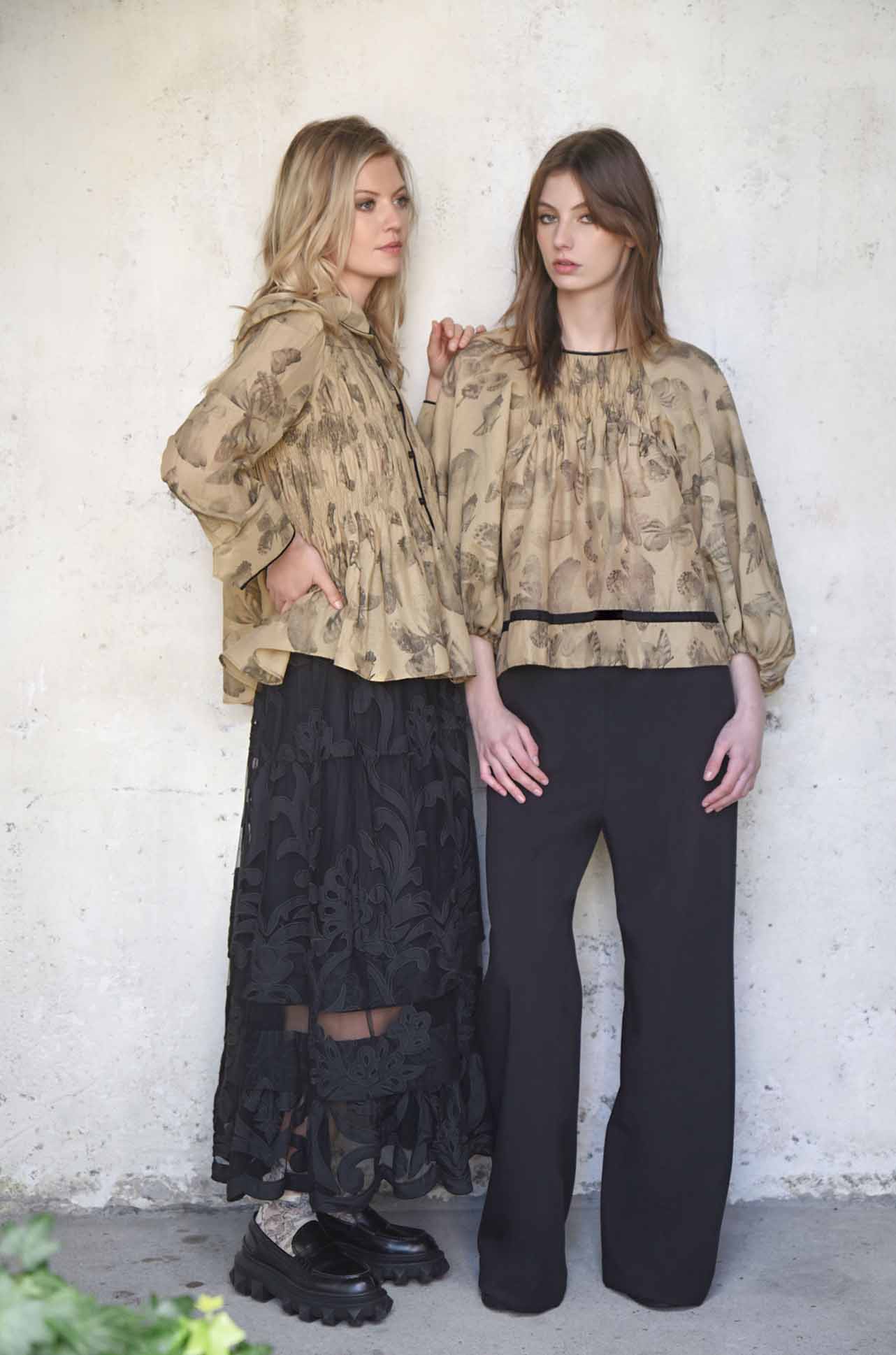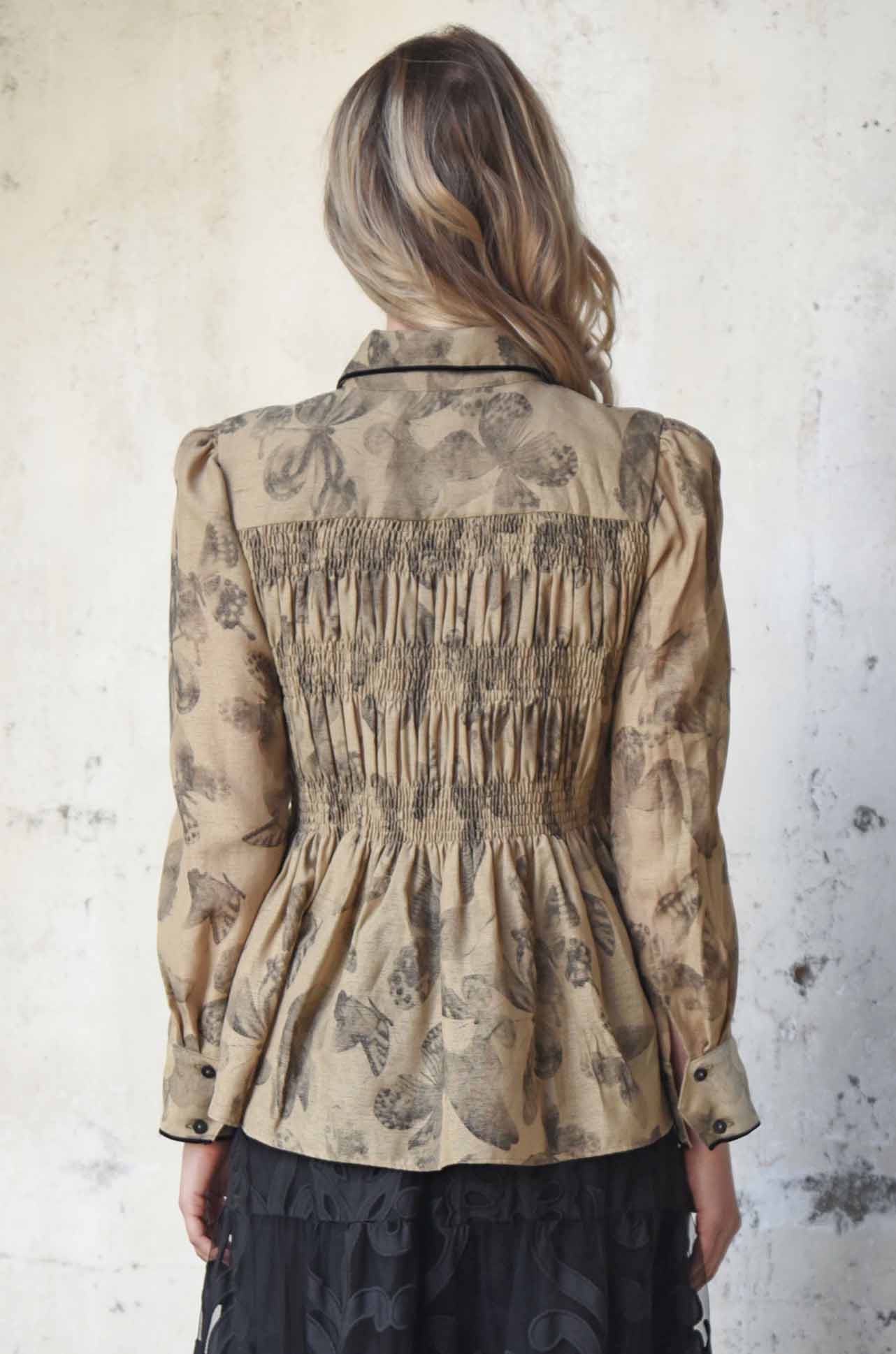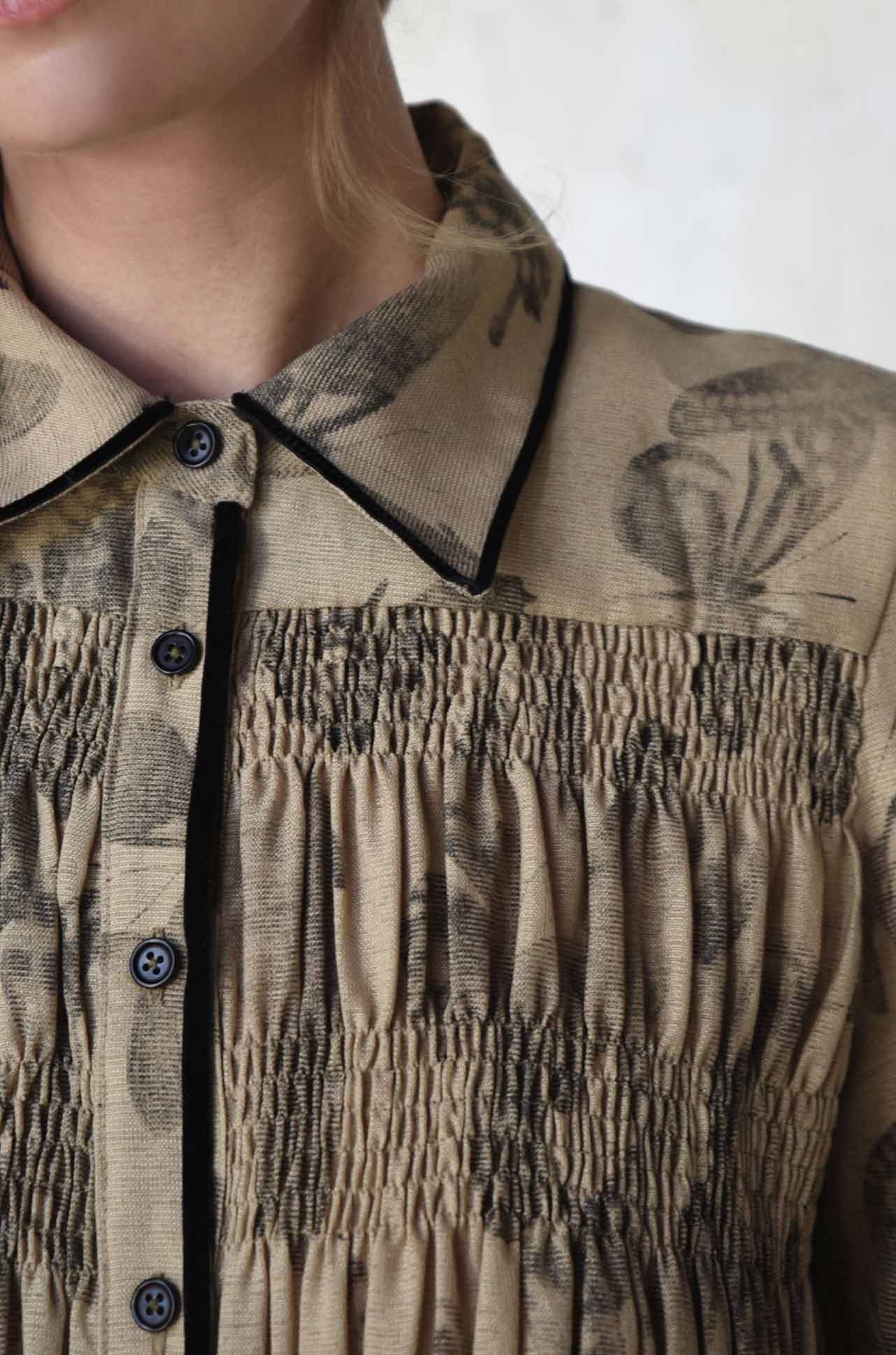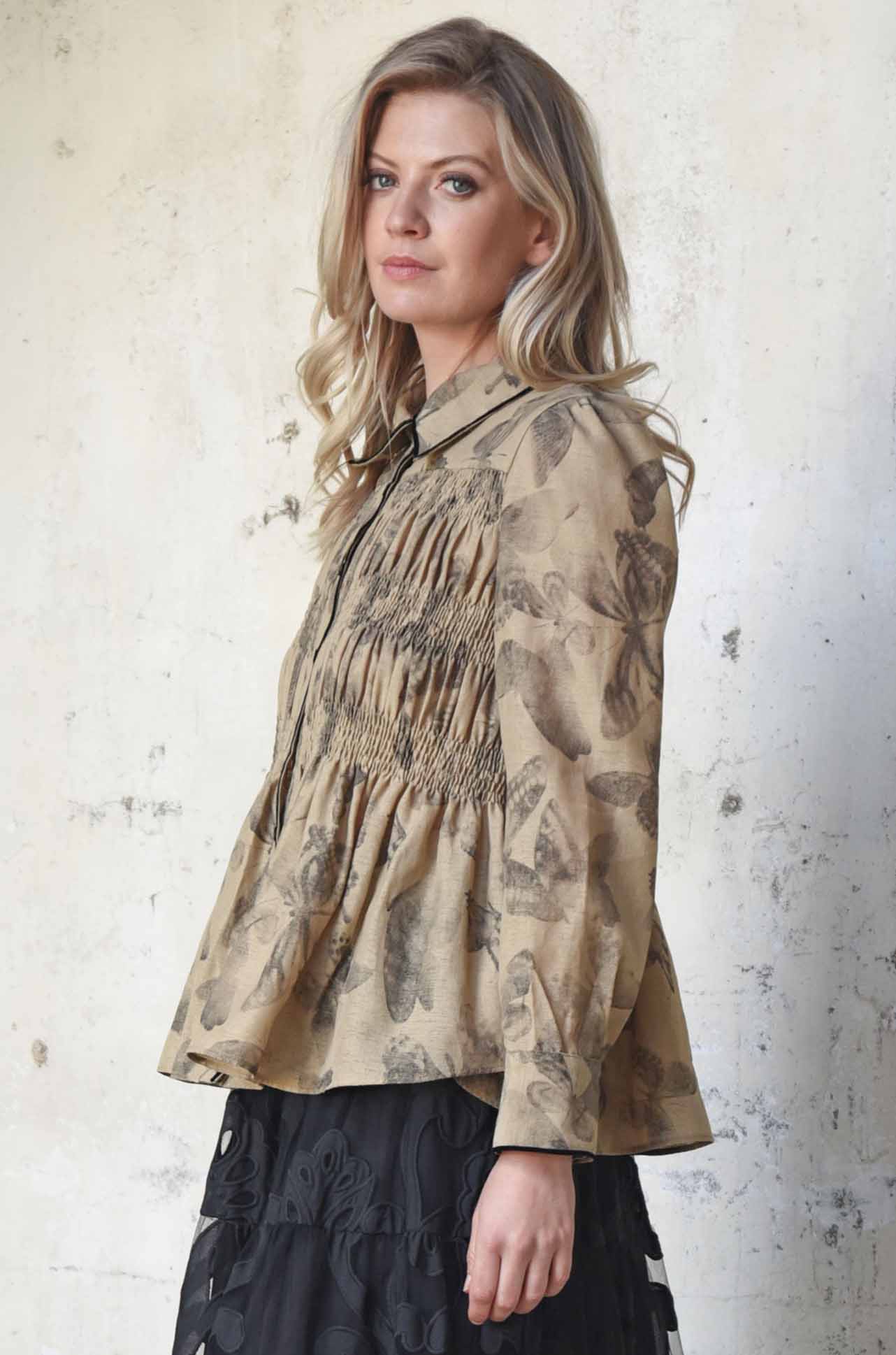 Soft shirring sculpts the front and back bodice of the 'Shirred Vision' shirt, giving shape and subtle texture to airy 'Float Like a Butterfly' printed gauze. A classic collar and button-through front provide timeless structure, while velvet trims at the placket edge, collar, and cuffs add a touch of luxe refinement. Finished with buttoned cuffs, it’s a delicate, elevated shirt that balances lightness with thoughtful detail.