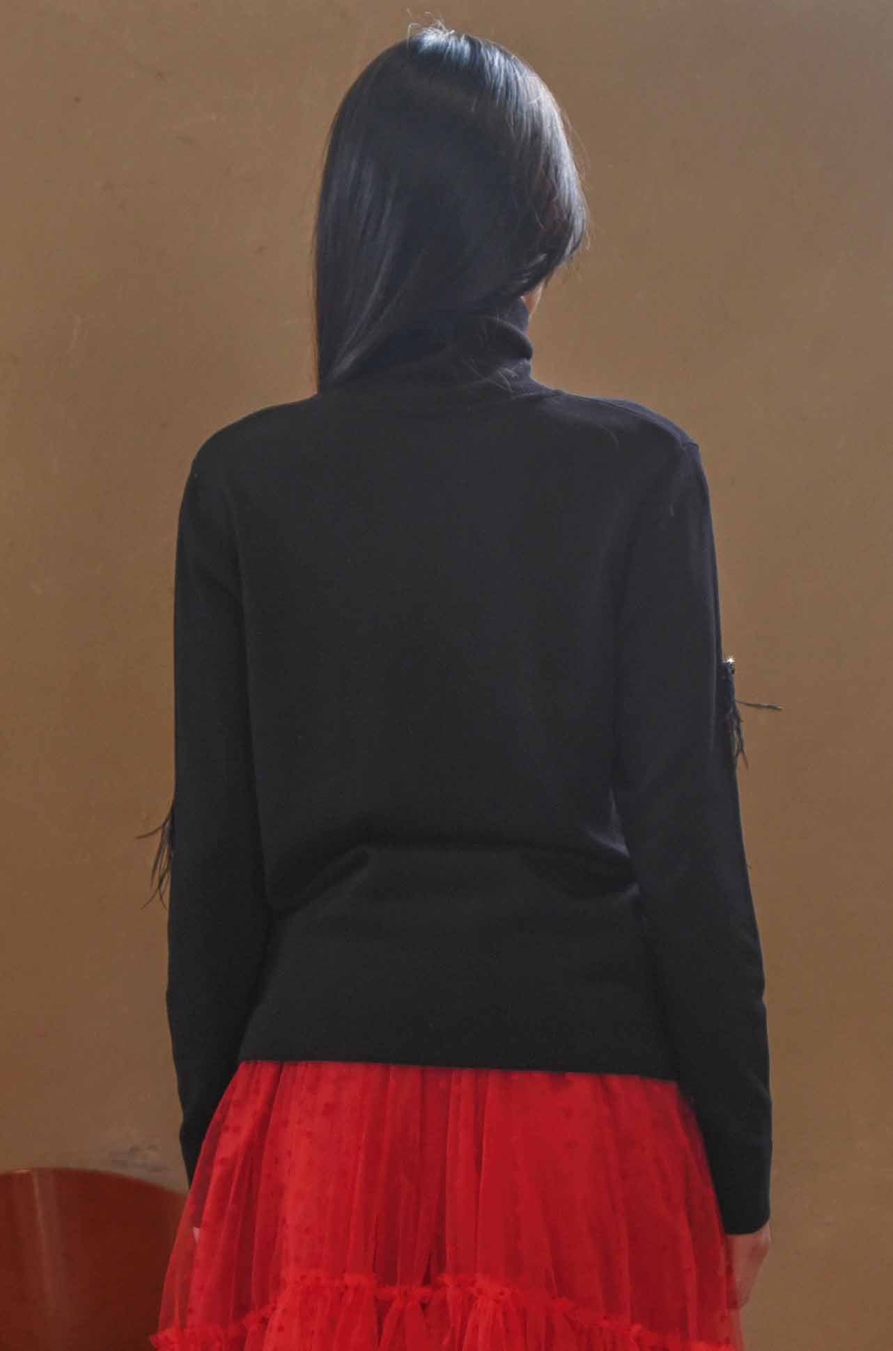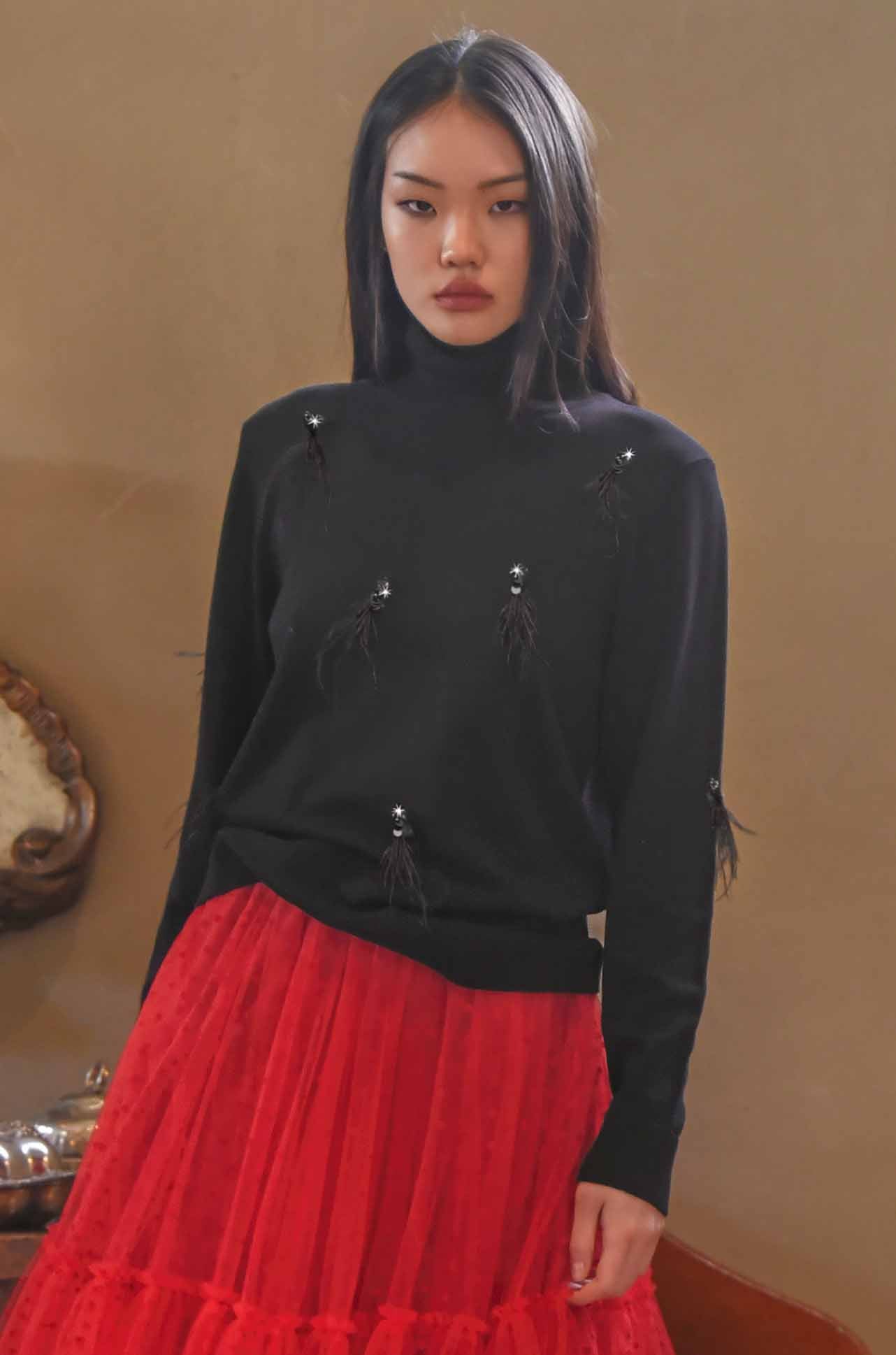 Adorned with sparkling gemstone and feather embellishments, the 'Neck-st Level' top brings a touch of high-impact glamour to your cold-weather wardrobe. Crafted in our cosy 'Warm It Up' viscose-blend knit, it features a sculptural roll neck that adds modern refinement to its soft, easy drape. A statement-making piece that transforms any look with effortless allure.