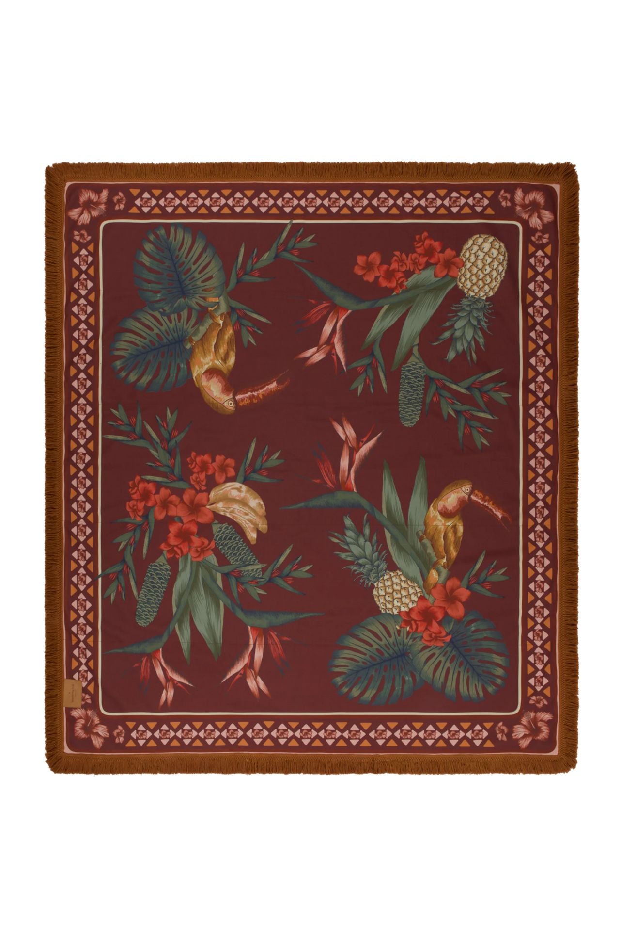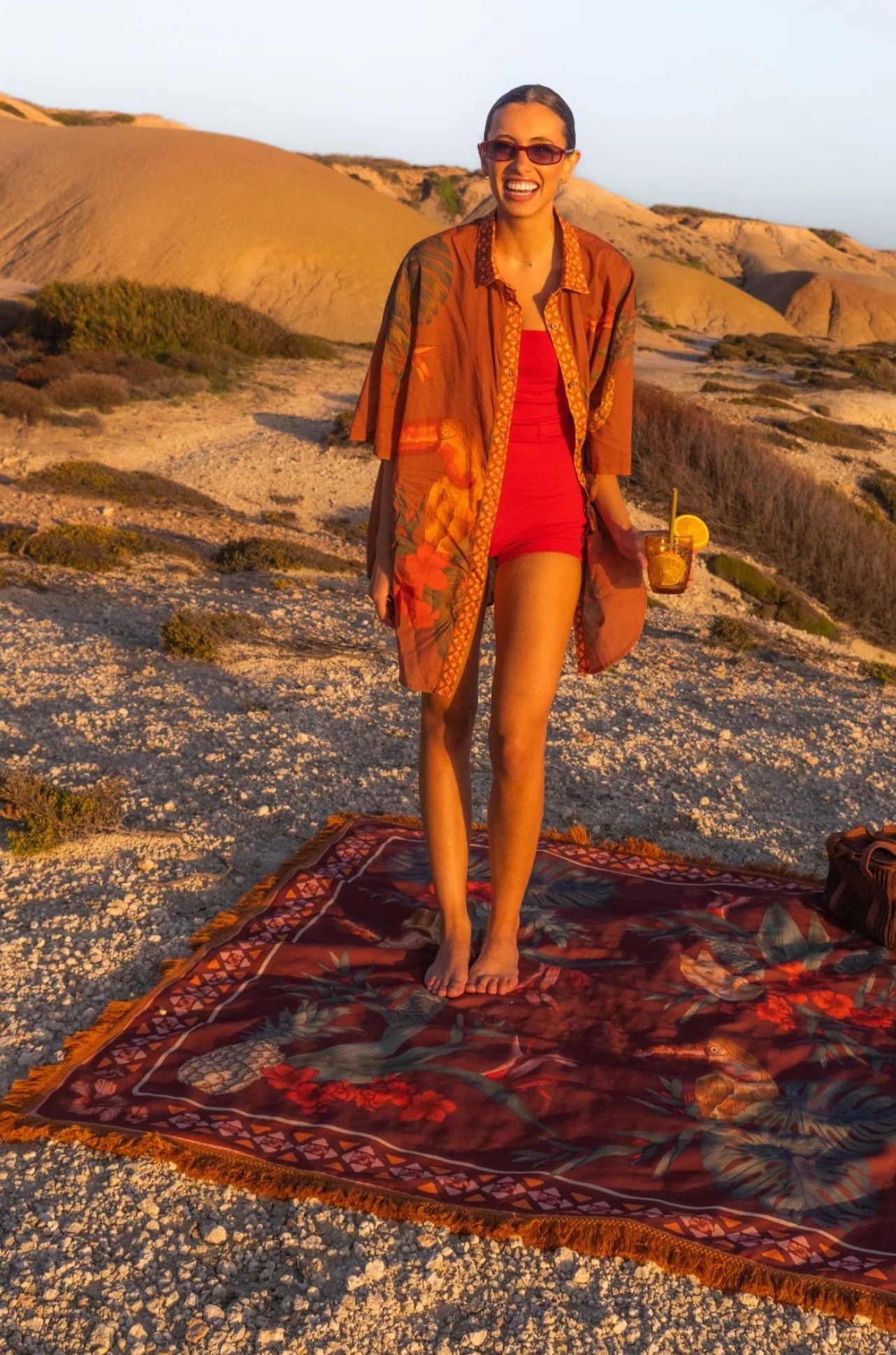 The 'Cuban Tropical Picnic Rug' from The Wandering Folk features a hand-drawn, vintage Cuban-inspired floral design. Bursting with tropical charm and nostalgic flair, toucans, pineapples, and bird of paradise bloom across fabric made from recycled PET (plastic bottles) rich browns, jungle greens with highlights of coral reds. Edges of picnic rug have a dark brown cotton fringe for that vintage feel.