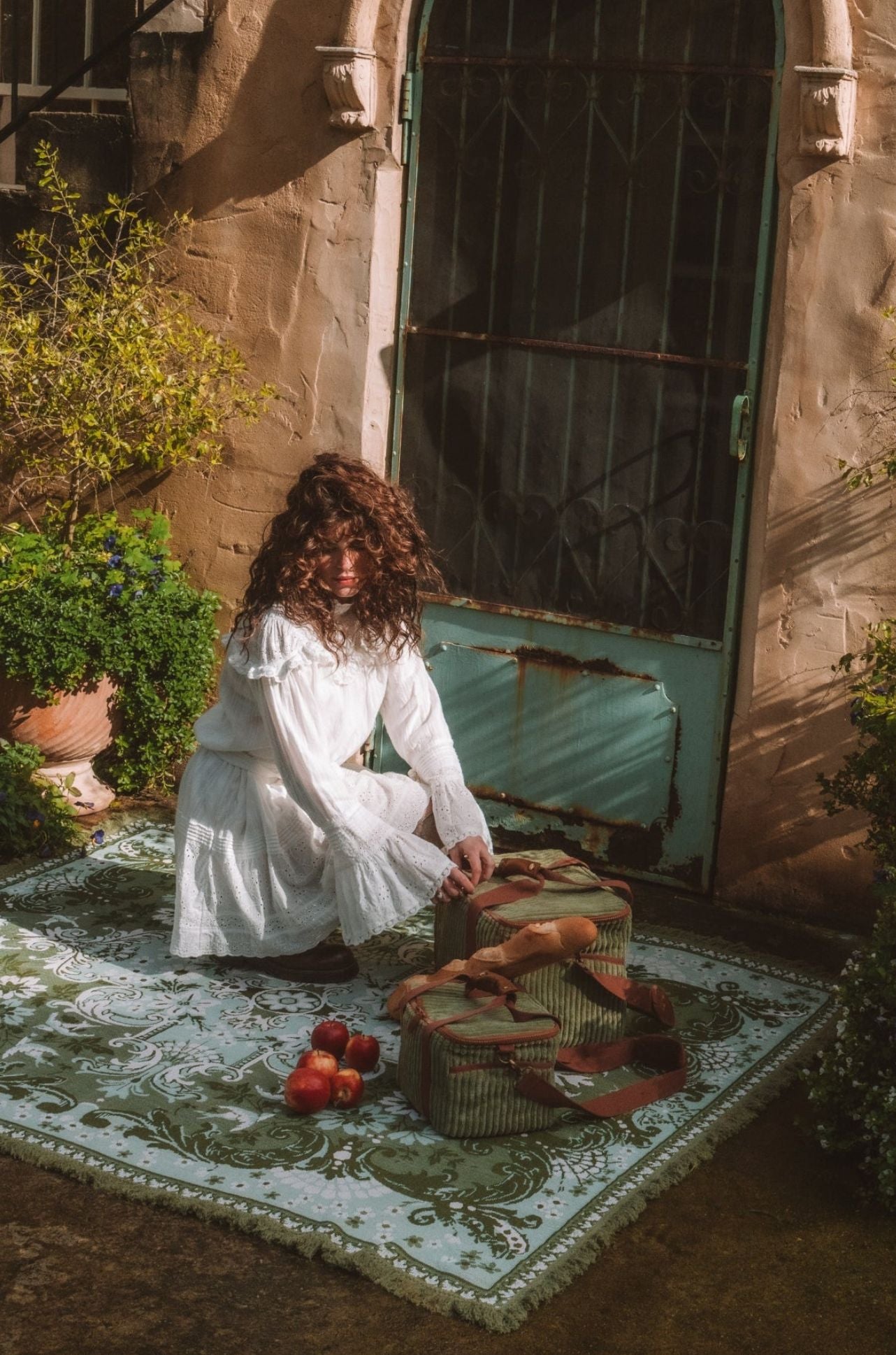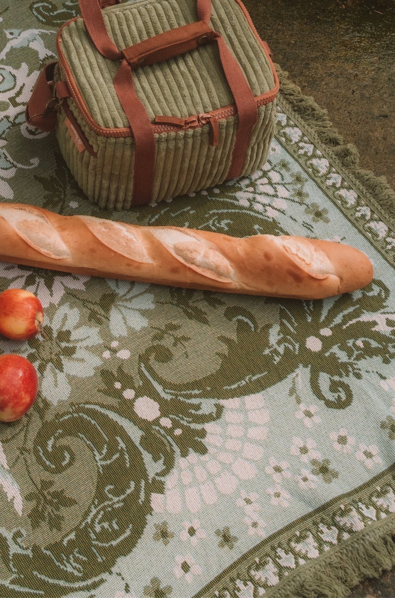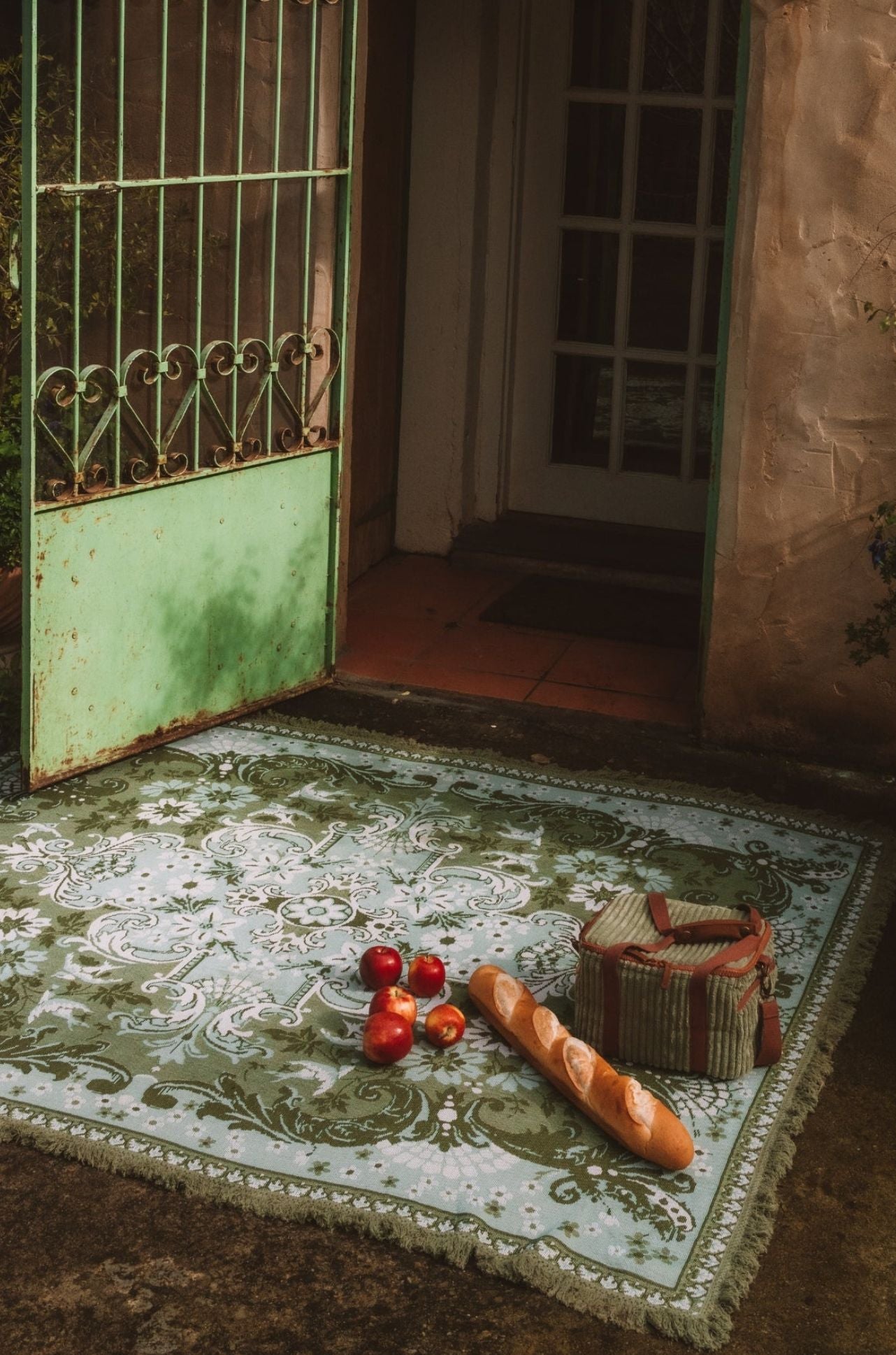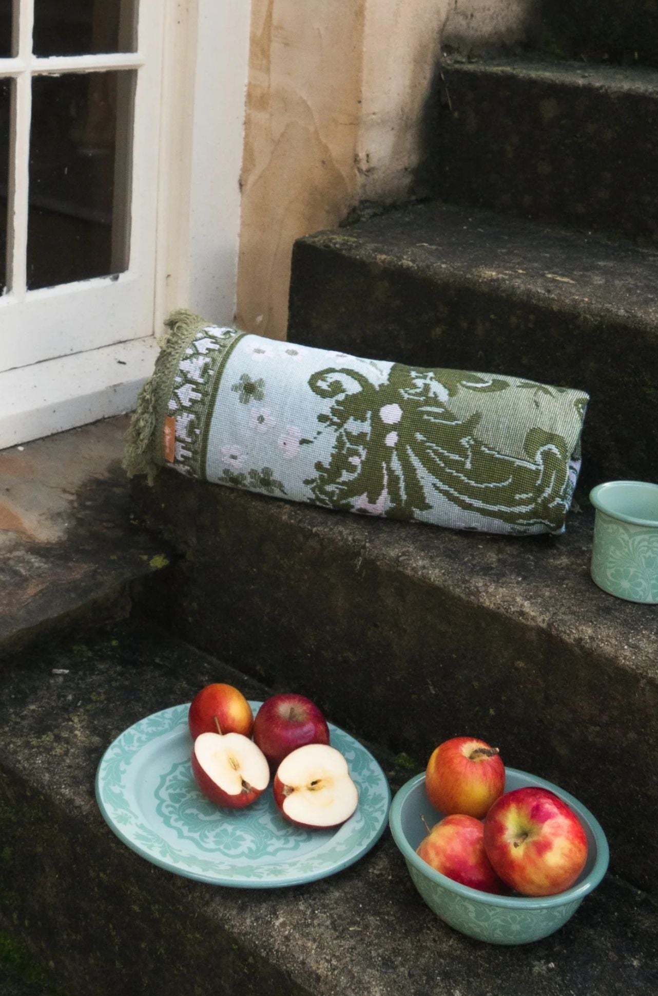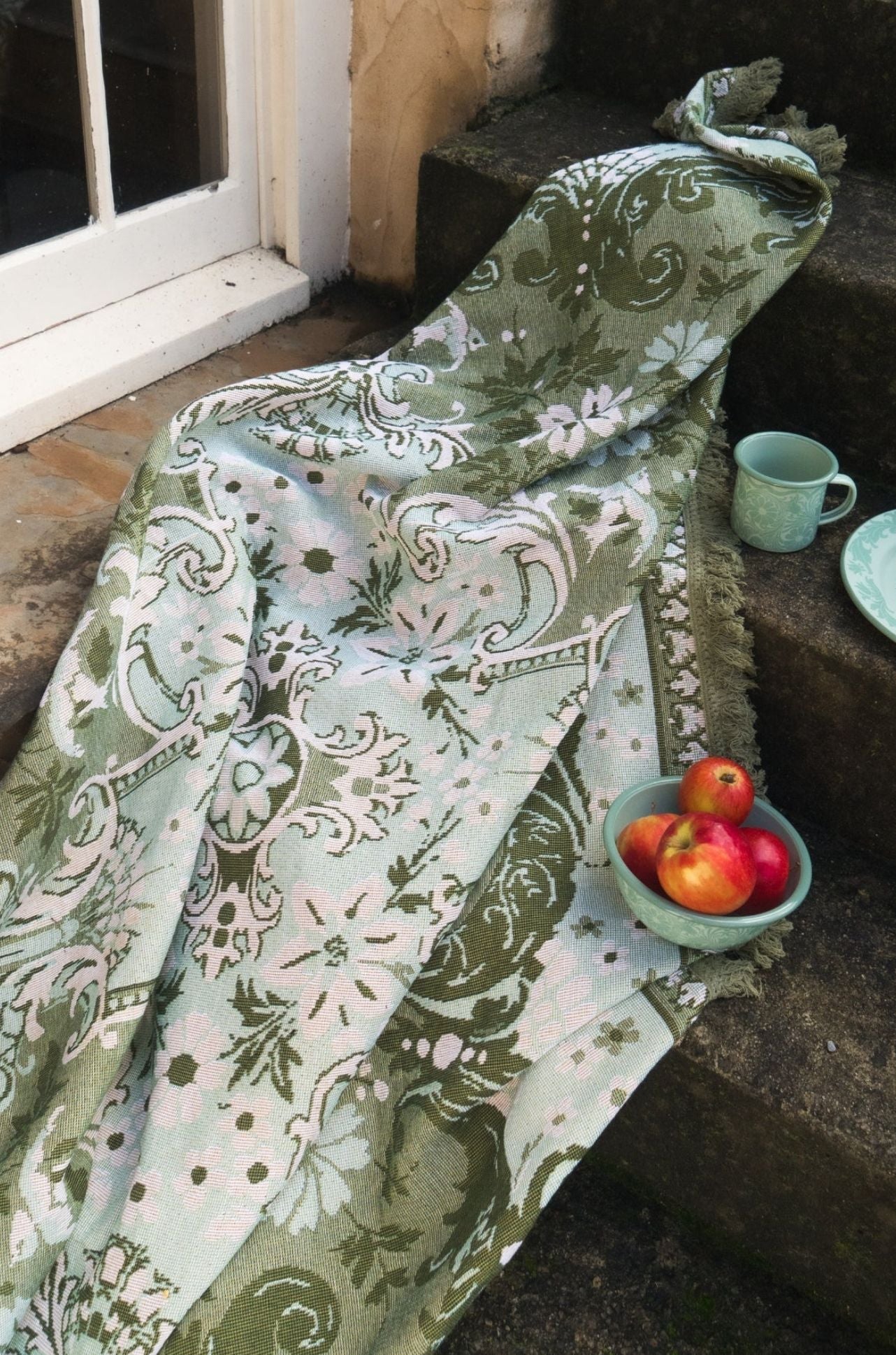 The 'Ornate Floral Throw' from The Wandering Folk is a new dreamy greenFern colour to the Ornate ginger and Ornate Rosè, long time favourites of our Wandering Folk community. It features a vintage inspired woven, floral design with coloured cotton fringing.